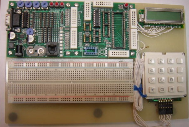 Project 1 is my development board platform. I needed a board that has a basic development board, a keypad, an LCD, and a breadboard area for special circuits. Boards such as these can be bought, but I had all the components to build my own, so that's what I did. See the photo below.
